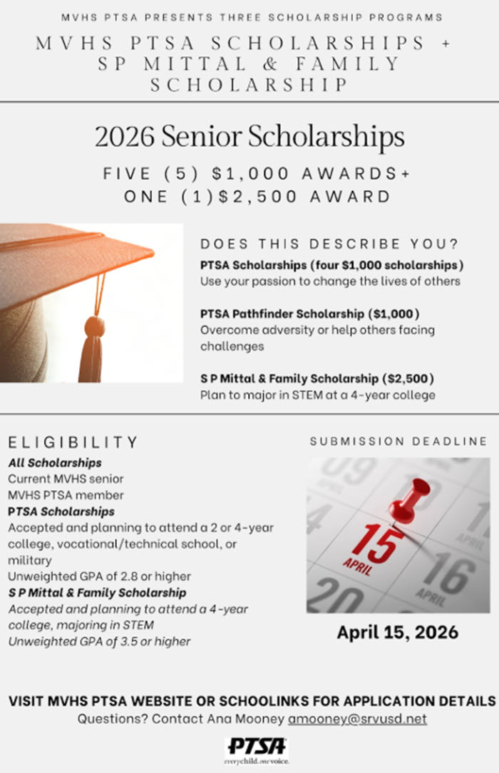 Monte Vista PTSA is pleased to administer three scholarship programs for the 2025-2026 school year. Please click on the links below for more information about each scholarship and to apply. Application deadline: Wednesday, April 15, 2026.